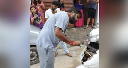 The video opens with the man using a small screwdriver to capture the spectacled cobra hidden inside the scooterette. As the man pokes it, the cobra raises its head from inside the scooterette, and hisses angrily. It further curls itself around the scooterette, resisting the man’s advances. However, the man manages to grab its tail and captures the serpent with his bare hands. Meanwhile, terrified onlookers record the unusual scene on their mobile phones.